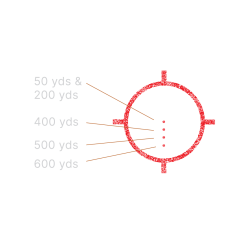 Ce réticule balistique est conçu pour une munition 5.56 Nato/.223 cal, balle de 62 grains M855 FMJ, avec une vitesse d’environ 2 680 fps et un canon de 14,5 pouces.
