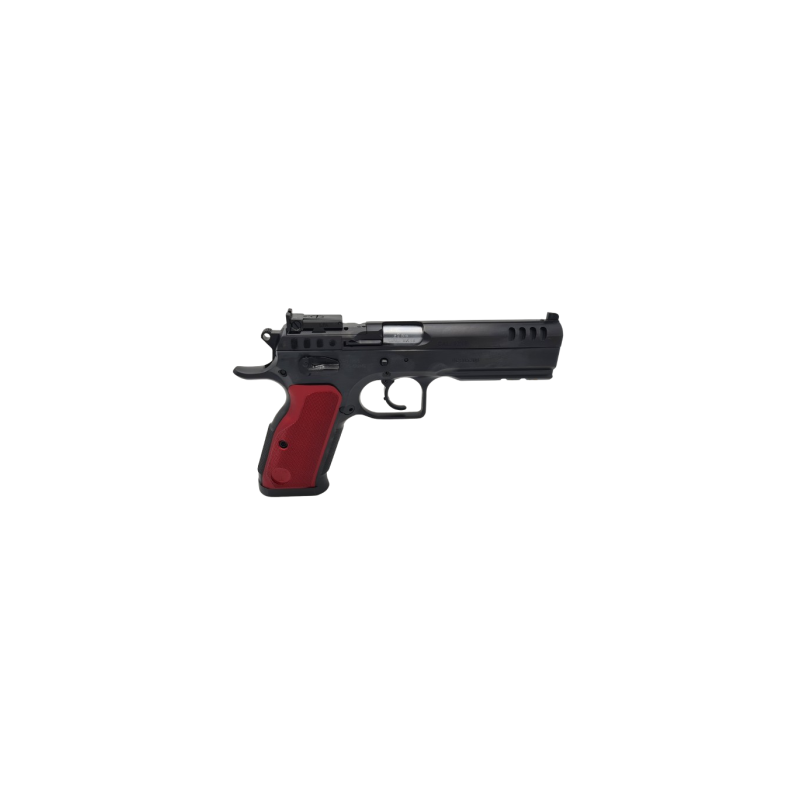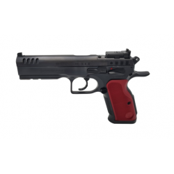 Nous retrouvons sur ce pistolet l'ergonomie si particulière aux pistolets Tanfoglio, l'axe du canon très bas sur la main. Ajoutez l'effet contrepoids apporté par le rail Piccatiny, Vous aurez en main un pistolet dont le relèvement au tir est très modéré, apportant un meilleur confort.