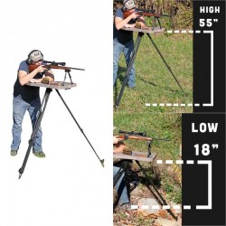 La table de tir High-Low est une véritable table de tir mobile et réglable en hauteur pour le terrain. Elle peut être installée là où aucune table ne pouvait l'être auparavant. Le secret réside dans la conception du trépied qui lui permet de travailler sur un sol irrégulier, du gravier, de l'herbe, des collines, etc. Les pieds réglables indépendamment se verrouillent solidement en place grâce à deux systèmes de verrouillage par pied. Les pieds en acier de type piquet sont dotés d'étriers latéraux qui facilitent l'ancrage dans le sol, offrant ainsi une prise ferme partout où la nature vous emmène. Bien qu'ils ne soient pas conçus pour les surfaces dures telles que le béton ou la terre battue, ils conviennent parfaitement à un affût de chasse recouvert de moquette. Le degré de réglage du High-Low est inégalé avec une hauteur basse de 18" (45.7 cm) à une hauteur impressionnante de 55" (139.7 cm) du sol. Réglez-le aussi haut ou aussi bas que vous le souhaitez.