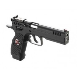 Nous retrouvons sur ce pistolet l'ergonomie si particulière aux pistolets Tanfoglio, l'axe du canon très bas sur la main. Ajoutez l'effet contrepoids apporté par le rail Piccatiny , vous aurez en main un pistolet dont le relèvement au tir est modéré, apportant un meilleur confort.