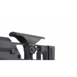 Le boîtier inférieur renferme une détente match-grade entièrement réglable, permettant à l’utilisateur d’ajuster la course selon ses préférences. La crosse du MRAD se replie vers la droite, réduisant l’encombrement pour un transport facilité. Une fois déployée, elle se verrouille solidement, offrant une stabilité équivalente à celle d’une crosse fixe.