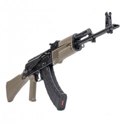 Le canon en acier 4150 nitruré offre un bon compromis entre précision, durabilité et résistance à la chaleur. Le tout est assemblé sur un boîtier en acier estampé de 1 mm avec rail latéral pour optique. La finition FDE (Flat Dark Earth) du garde-main, de la poignée et de la crosse donne un aspect moderne et tactique, tout en conservant l’ergonomie classique AK.