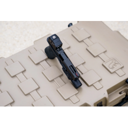 Une seule goupille de démontage, située de manière pratique à l’avant du pontet, permet de fixer la poignée amovible au châssis en acier. Par conception, la détente est logée dans le châssis, ce qui permet d’effectuer des mises à jour de la poignée sans démonter entièrement le pistolet.