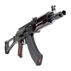 Le pistolet est fini avec un garde-main supérieur et inférieur en bois vernis prune, une poignée bois quadrillée assortie, un bracelet pliant triangulaire latéral, et un chargeur de 30 coups (selon la législation applicable).