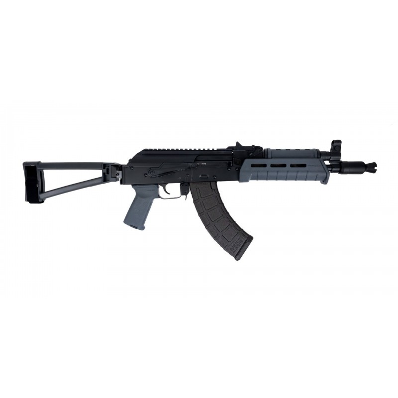 Finition avec garde-main Magpul MOE AKM gris, attelle pliante triangulaire grise, et poignée Magpul AK-47 gris.