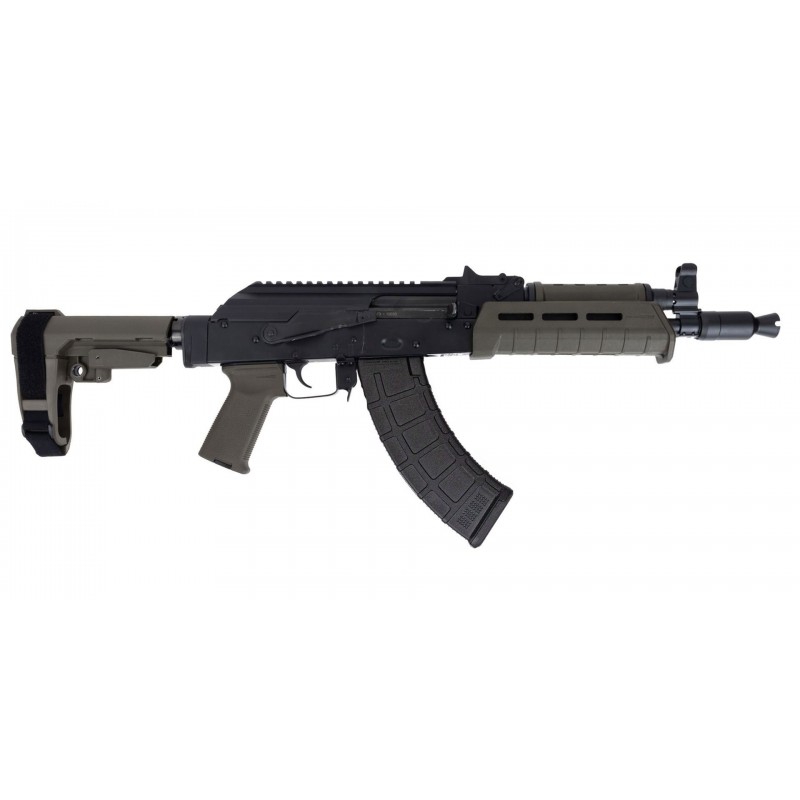 Cette version est équipée d’un garde-main Magpul MOE en polymère vert olive, d’une crosse SBA3 réglable montée sur adaptateur M4, et d’une poignée Magpul AK-47 polymère assortie. Le pistolet est livré avec un chargeur 30 coups, où la loi l’autorise.