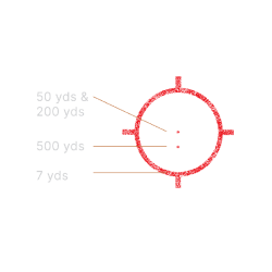 Ce réticule balistique est conçu pour une munition 5.56 Nato/.223 cal, balle de 62 grains M855 FMJ, avec une vitesse d’environ 2 680 fps et un canon de 14,5 pouces.