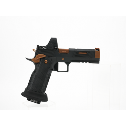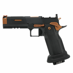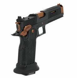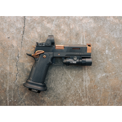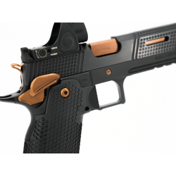 Ce modèle exclusif comprend une poignée en acier, un puit de chargeur de compétition et une détente plate striée pour un contrôle et un ressenti supérieurs. Le canon et les petites pièces sont revêtus d’un revêtement Alpha TAC Copper PVD (TiAlCN), tandis que le reste du pistolet bénéficie d’une finition durable Cerakote et DLC.