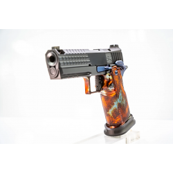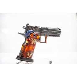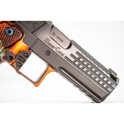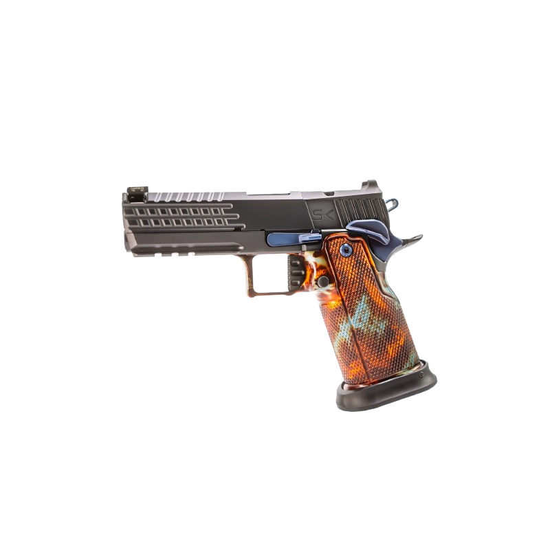 Le SideKick est une édition exclusive issue d’une collaboration avec SK Guns, dotée d’un canon de 4,25 pouces (108 mm) et équipée de la poignée Pro Evo taille standard la plus populaire de Phoenix Trinity. Ce modèle est proposé en édition limitée à 10 exemplaires anodisés color case et 20 exemplaires anodisés noirs avec des accents bleus en dépôt physique en phase vapeur (PVD), tous revêtus d’un traitement DLC noir (carbone type diamant) sur la glissière et la carcasse pour une durabilité accrue.