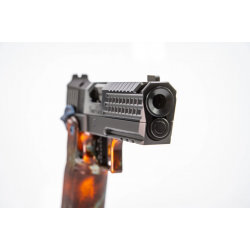 L’arme intègre un système compensé V-Port interne, garantissant une réduction du recul et du relèvement du canon, pour un acquisition plus rapide de la seconde cible. Le guidon est équipé d’un insert tritium vert avec un cercle de visée LumiGreen.