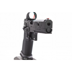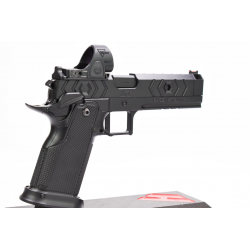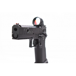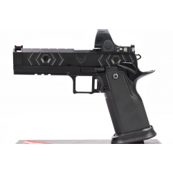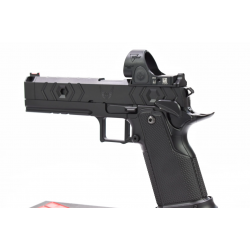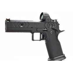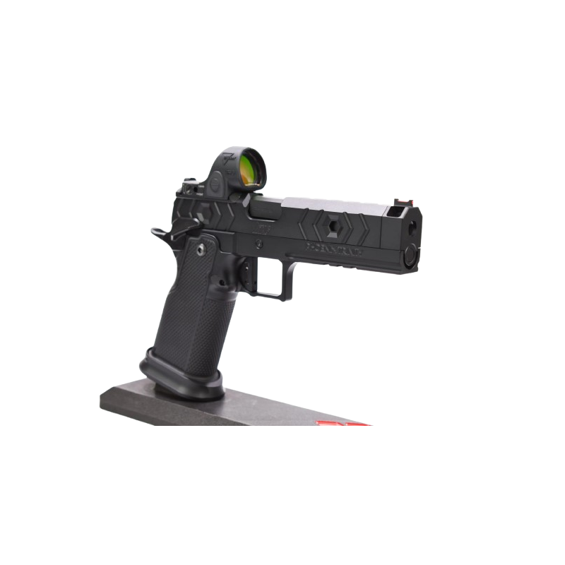 Le H-Tac double empilement est conçu pour ceux qui valorisent une qualité et un savoir-faire élevés, en plus de la protection personnelle, de la défense à domicile et même de l’usage en compétition. Il présente des stries de glissière avec des trous traversants, des ports de canon inclinés qui dirigent les gaz loin de votre ligne de mire, et est complété par des organes de visée co-témoins prêts à l’emploi pour maintenir la visée sur la cible.